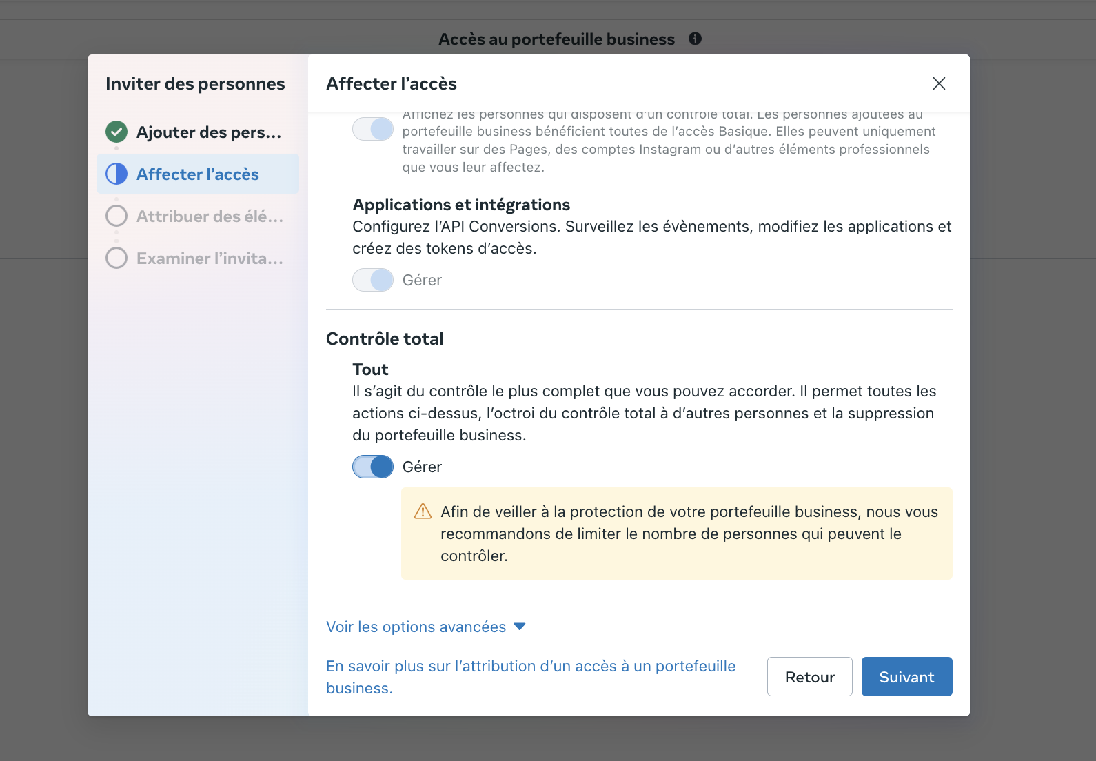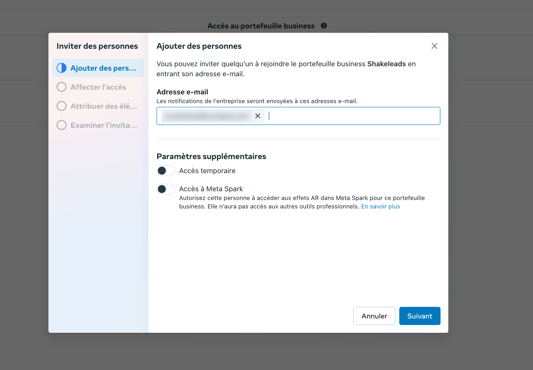 Cliquez sur "Inviter des personnes" et rajoutez l'adresse email que nous vous avons communiqué en donnant un "Accès Total" (très important nous ne pourrons pas vous aider avec un Accès partiel) pour que nous puissions raccorder votre numéro WhatsApp.